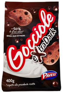 Pavesi, Gocciole eXtraDark. Ingredienti: farina di FRUMENTO, zucchero, olio di semi di girasole, cioccolato extra 13% (pasta di cacao 75%, zucchero, emulsionante: lecitina di SOIA, aroma naturale vaniglia), amido di FRUMENTO, BURRO, cacao 2%, cioccolato 1,8% (zucchero, pasta di cacao, cacao magro, aroma naturale vaniglia), cacao magro 1,2%, agenti lievitanti (carbonato acido di ammonio, carbonato acido di sodio), aromi (LATTE), sale. Può contenere tracce di FRUTTA A GUSCIO e UOVA. |