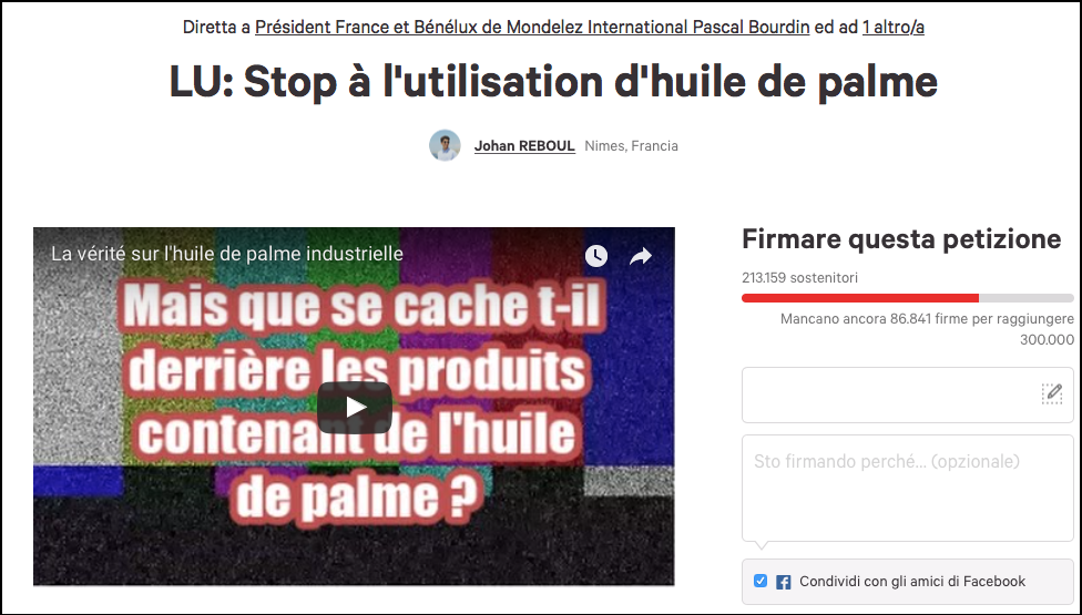 Redazione 28 Luglio 2017Oltre 213 mila firme per chiedere alla Lu, marchio francese di biscotti e prodotti da forno, di abbandonare l’olio di palma. La petizione è stata lanciata nell’ottobre 2015 sulla piattaforma Change.org da Johan Reboul, un giovane liceale allora diciassettenne di Nimes.