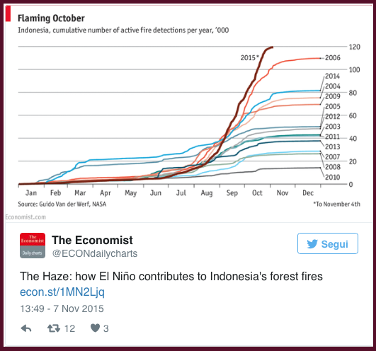 Hanno iniziato a diminuire solamente a partire dal 26 ottobre, grazie all’arrivo di intense piogge. Incendiare i terreni per ripulirli dagli scarti degli ultimi raccolti è considerato il modo più efficace (soprattutto il più economico) per poter subito ricominciare a coltivare. Costruendo dei canali artificiali si blocca il “rifornimento” d’acqua che normalmente raggiunge le peatland forests, foreste torbiere, rendendo più rapido il divampare delle fiamme che vengono causate intenzionalmente dagli agricoltori e continuano a bruciare per giorni. La legge indonesiana vieta espressamente di ricorrere a questa tecnica -anche per quanto riguarda le piantagioni di olio di palma– ma viene violata portando alle conseguenze che oggi vediamo. La stagione degli incendi in corso è ancor più esacerbata dagli effetti di El Niño, che ha colpito con più forza rispetto al 1997, lasciando dietro di sé un Sudest Asiatico dal clima estremamente secco e caldo.
