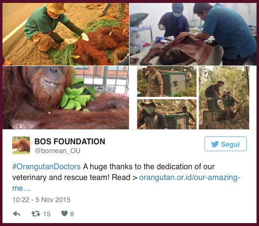 Stranamente neanche immagini come questa, che negli ultimi due giorni ha fatto il giro del mondo, sono riuscite più di tanto a distogliere l’attenzione pubblica dall’ansia per l’olio di palma nei biscotti e a portarla verso la problematica della sostenibilità. Laddove – insieme al disboscamento illegale per destinare il legno ad altre industrie – la coltivazione intensiva di palme sta causando il disastro vero, e volontari come gli affiliati a IAR (International Animal Rescue) mettono a rischio la propria salute per salvare gli animali da un inferno di fiamme. Respirando un inquinamento che mette a dura prova la salute di un primate almeno quanto strema la nostra. Recuperare animali spesso terrorizzati, oltre che in pericolo, non è facile. Come non lo sono le operazioni necessarie a riportare gli oranghi in natura dopo averli rimessi in sesto (qui un video di IAR), con la consapevolezza che aree oggi sicure potrebbero prendere fuoco nei giorni a venire.