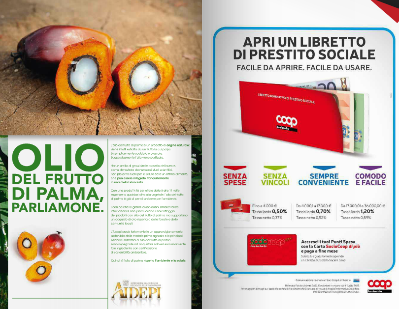La lista dei giornali che hanno ospitato la pubblicità dell’olio di palma si allunga e, dopo Sette il settimanale del Corriere della sera, segnaliamo il mensile dei soci COOP Consumatori e il periodico dei soci Conad. A questo punto l’investimento complessivo arriva a 1 milione di euro.