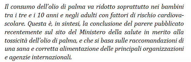 La dieta bilanciata è quindi un sogno visto che ogni italiano assume mediamente 12 g al giorno di palma e che molti ragazzini arrivano tranquillamente al doppio. Basta mangiare 4 biscotti tipo Molinetti Mulino Bianco a colazione per arrivare a 12 g circa, poi bisogna aggiungere gli altri prodotti. In ogni caso per capire quanto sia scorretta e ambigua la pubblicità dei produttori basta leggere la prima frase di questo articolo firmato dall’Istituto Superiore di Sanità che chiarisce bene il problema.