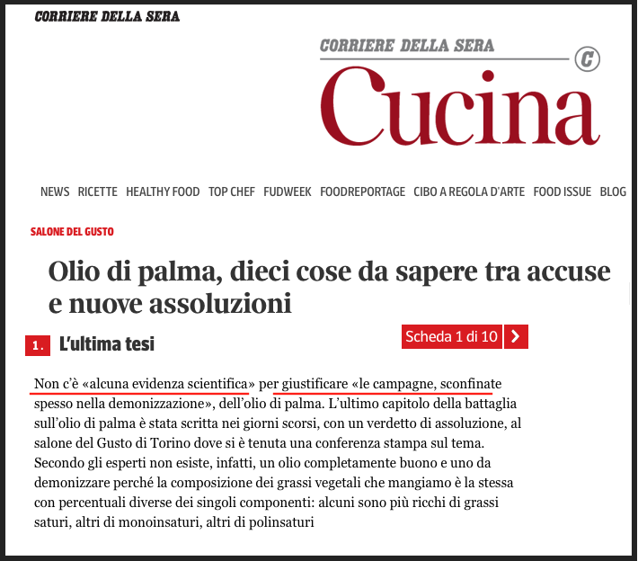 Non c’è «alcuna evidenza scientifica» per giustificare «le campagne, sconfinate spesso nella demonizzazione», dell’olio di palma. Che tristezza leggere su Corriere della sera.it, Wired e su altri media titoli e frasi di questo tipo che cercano in tutti i modi di salvare l’olio di palma, attribuendogli in alcuni casi qualità antitumorali. Nella grande operazione di recupero sono scesi in capo Dario Bressanini, Slow Food e altri soggetti. Molto probabilmente queste persone hanno letto in modo distratto i dossier dell’Istituto superiore di sanità e dell’Autorità europea per la sicurezza alimentare e quelli delle altre agenzie della salute francesi (Anses) e olandesi. I documenti senza troppi giri di parole puntano il dito contro sull’olio tropicale sconsigliandone l’uso e soprattutto l’abuso che si è fatto finora in Italia. La difesa impossibile del palma gioca su quattro elementi abilmente manipolati e ripetuti fino alla noia.