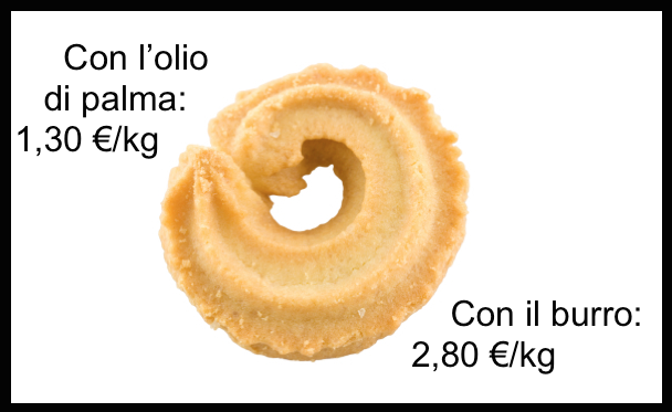 I conti sono presto fatti. Per preparare un chilo di biscotti servono 500 g di farina, 200 g di zucchero, 4 uova (0,10×4) e 250 g di burro o grasso di palma. I primi tre ingredienti insieme comportano una spesa di circa un euro, poi bisogna sommare 0,25 centesimi se si usa il palma o il girasole e la spesa complessiva arriva a 1,25 euro. Se invece si usa il burro o un altro grasso nobile il costo finale quasi raddoppia (2,1 euro). Alla fine la scelta di utilizzare un grasso nobile come il burro risulta eccessivamente gravosa perché  costituisce l’ingrediente più costoso della ricetta e le industrie preferiscono il palma.