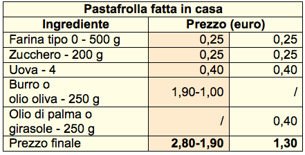 Per fare un esempio più in linea con la nostra quotidianità, abbiamo provato a preparare la pasta frolla in casa utilizzando nel primo caso farina zucchero e uova insieme a olio di girasole (che ha un prezzo simile al palma) e nel secondo caso  burro o l’olio di oliva. La differenza (vedi tabella sotto)  è sin troppo evidente: si passa da 1,30 euro per la pasta frolla con olio di palma o girasole  ai 2,80 per la pasta frolla tradizionale fatta con il burro tradizionale ai 1,90 euro se si usa olio di oliva e 1,30 se si usa olio di palma o girasole. Chi vuole usare l’olio di oliva spende 1,90 euro.