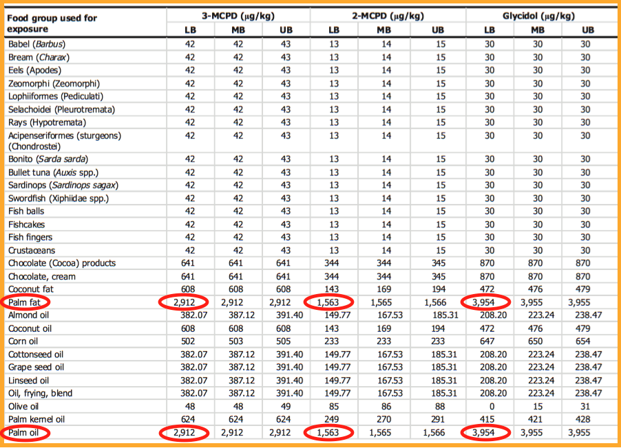 (*) L’Efsa ha focalizzato l’attenzione sull’olio di palma perché secondo i dati presi in esame le quantità presenti sono di gran lunga superiori rispetto agli altri grassi vegetali 6 – 7 volte superiore rispetto all’olio di mais, alle miscele di olio per friggere e almeno 70 volte rispetto all’olio di oliva per quanto riguarda il 3-MCPD e valori ancora più elevati per 2-MCPD e il glicidioso indicato come estere glicidico (vedi tabella 2).
