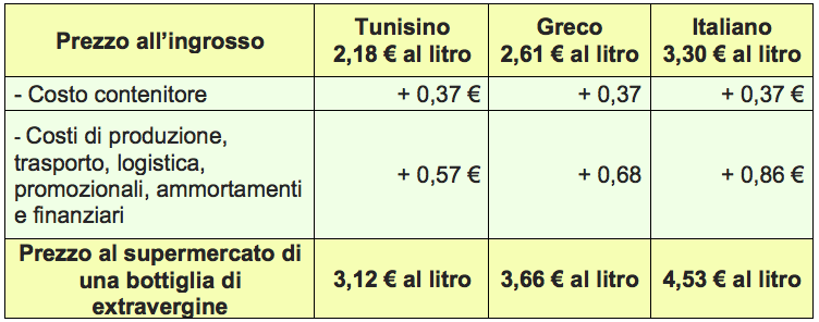 Per rendersi conto facciamo un passo indietro e vediamo cosa succede nei mercati all’ingrosso, dove i prezzi variano a seconda della qualità, dell’anno di raccolta, dell’origine e di altri fattori. Osservando il borsino pubblicato ogni settimana dal sito Teatro Naturale, si vede che negli ultimi mesi il prezzo dell’olio spagnolo oscilla intorno a 2,30 €/kg (equivalenti a 2,11 €/litro), quello tunisino sui 2,38 €/kg (equivalenti a 2,18 €/litro), il greco a 2,85 €/kg (equivalenti a 2,61 €/litro) e infine quello italiano a 3,60 €/kg ( equivalenti a 3,30 €/litro) (*).