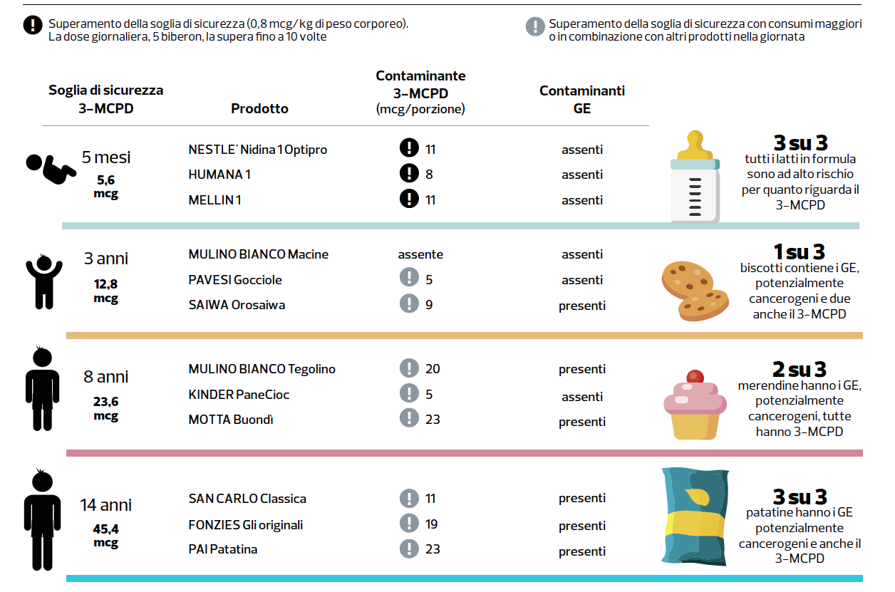 Un analogo concetto è ribadito nel parere di Valentina Rabella del servizio di igiene e prevenzione della Regione Marche basato sul documento dell’Efsa quando scrive “La stima della media e le esposizioni elevate al monocloropropandiolo (sia 3-MCPD che 2-MCPD) per le fasce di età più bassa, adolescenti compresi (fino a 18 anni di età), superano la dose giornaliera tollerabile e costituiscono un potenziale rischio per la salute”.