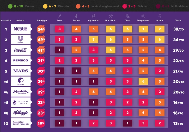 “Scopri il marchio”. Nell’alveo della campagna “COLTIVA – il cibo, la vita, il pianeta” il rapporto di Oxfam classifica le politiche adottate dai 10 primi gruppi industriali del settore alimentare, in relazione a 7 temi: