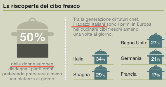 Un’ultima nota riguarda la parte finale dell’infografica, che ancora una volta non corrisponde al testo del comunicato. Nello spiegare la “riscoperta del cibo fresco” l’autore interpreta i dati facendo una sottile discriminazione di genere, distingue cioè la preparazione domestica, riservata alle donne, dalla cucina più importante degli “chef”, che invece è portata avanti dai “ragazzi italiani”. (Foto a sinistra)