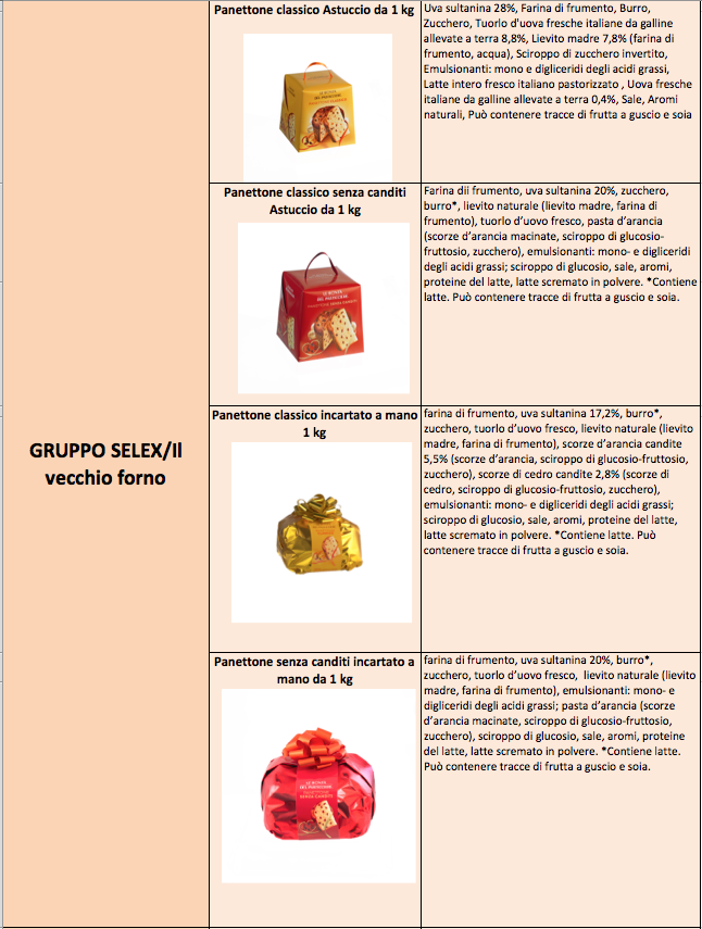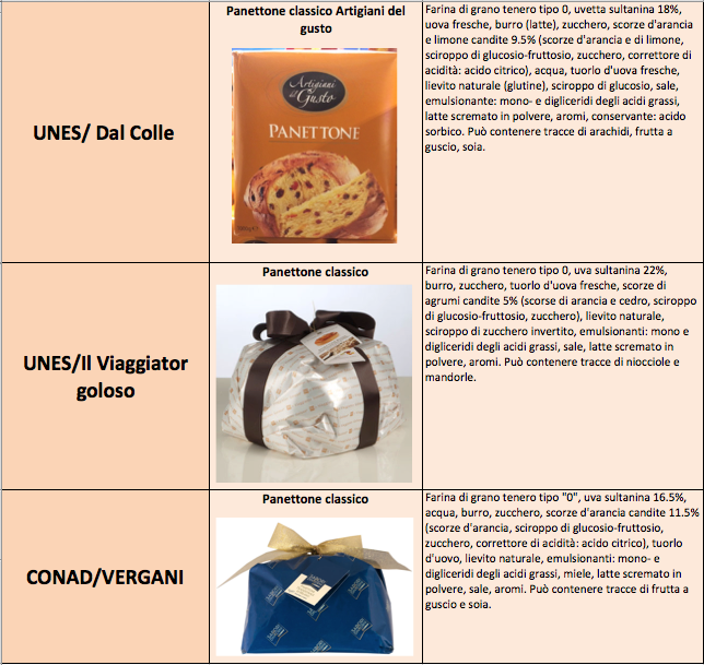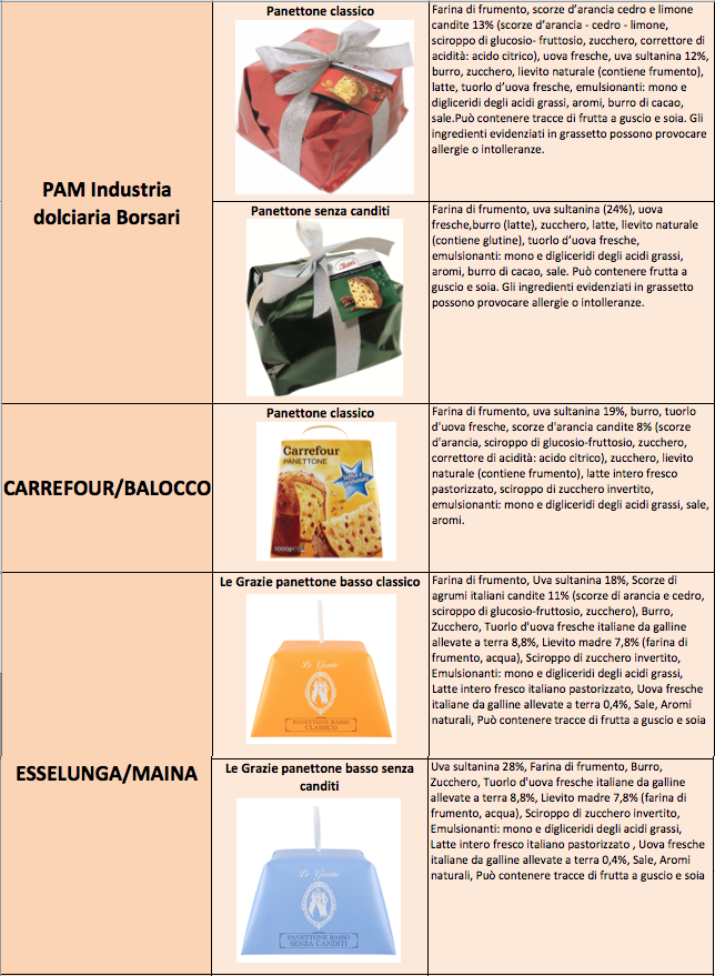 Per prima cosa consideriamo che esistono diverse categorie: il top di gamma, come le Tre Marie, non subisce il deprezzamento del marketing, mentre le grandi marche come Maina, Balocco, Paluani… hanno un prezzo intermedio (8-9 €/kg), che i supermercati presentano spesso in offerta a 4-5. Ci sono poi i prodotti delle insegne: Esselunga, Carrefour, Pam, Coop – per citarne alcuni – che propongono il loro panettone a prezzi ancora più bassi, 3-4 €/kg (venduti in offerta anche a 2,5!). Guardando però attentamente le etichette si scopre che i dolci sono stati prodotti dalle stesse grandi aziende del settore. Per esempio Maina produce per Coop, Balocco per Carrefour, Borsari per PAM. Capire quali sono le differenze tra il panettone Maina e quello Coop o Esselunga non è facile. Può variare la quantità di alcuni ingredienti di pregio o addirittura la loro provenienza, ma le differenze non possono essere esagerate anche volendo ipotizzare qualche differenza del processo produttivo. Stabilire la qualità del panettone industriale leggendo la lista degli ingredienti – un dolce disciplinato da un regolamento e di per sé “pregiato” realizzato con materia prima di qualità – non è semplice, perché la sofficità, l’aroma e il gusto vanno poi valutati nel piatto. Possiamo basarci sulla quantità di burro, di uvette e canditi indicati in etichetta, ma non sarà il prezzo a dirci quanto è buono il panettone scelto.