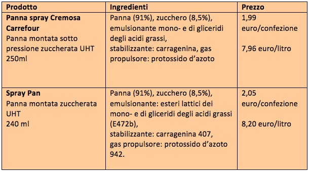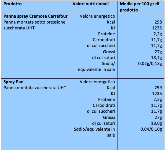 Chi non ha usato almeno una volta una bomboletta di panna spray? La scelta può cadere sul prodotto leader o sulla marca del supermercato. L’azienda leader in Europa è CO.DA.P che, oltre al propio marchio di panna montata Spray Pan (45% delle vendite), realizza anche confezioni per diverse catene di supermercati. Il Fatto Alimentare ha confrontato Spray Pan con la confezione La cremosa di Carrefour, prodotta e confezionata dalla stessa azienda nel medesimo stabilimento di Marcianise.