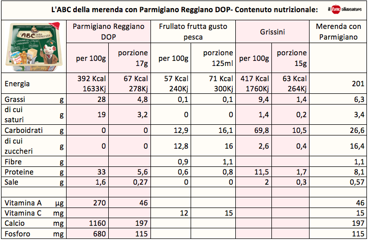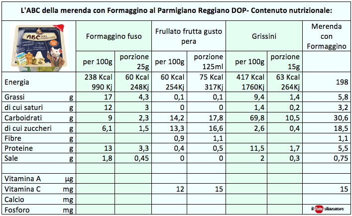 Le porzioni sono contenute, e per questo adatte alla merenda dei bambini. La busta di grissini è da 15 grammi, il brick del frullato da 125 ml e il formaggio è in formato da 17 grammi per il Parmigiano Reggiano DOP e da 25 grammi per il formaggino (vedi tabelle sotto).