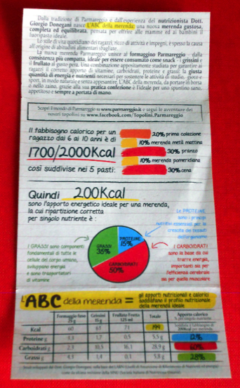 in effetti per mio figlio qualche volta lo compro, dal punto di vista nutrizionale trovo che sia ottimo, ma 1 euro non è affatto economico considerando che c’è un succo da 125 ml, 15 gr. di parmigiano e 3 minigrissini, tutti impacchettati singolarmente e messi in un’ulteriore custodia di plastica rigida, praticamente alla fine c’è più packaging che merenda, dal punto di vista ambientale è un vero attentato. SE poi me lo faccio in casa, ovvero prendo un pezzetto di parmigiano e lo avvolgo in carta stagnola, un pacchetto di crackers (magari integrali e che sono il quadruplo di quei 3 grissinetti) e un succo da 200ml, spendo meno della metà, mio figlio mangia di più (e le maggiori calorie per un bimbo che a scuola sia studia che corre non lo vedo come un problema) e inquino anche l’ambiente la metà.