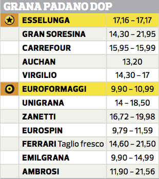 La seconda tabella propone la classifica delle marche di Grana Padano Dop esaminate nel test, affiancata dal prezzo minimo e massimo rilevato da Altroconsumo. Al primo posto troviamo Esselunga che ha ricevuto il giudizio migliore “composizione e aspetto impeccabili, sapore accettabile”. A metà classifica viene posizionato Euroformaggi indicato come il miglior acquisto avendo un prezzo interessante e una buona qualità (tra i migliori nella degustazione).