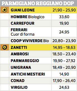 La prima tabella propone la classifica delle marche di Parmigiano Reggiano Dop esaminate nel test, abbinata al prezzo minimo e massimo rilevato da Altroconsumo. Al primo posto troviamo Giani Leone che ha ricevuto il giudizio migliore “ineccepibile su tutti i fronti”. A metà classifica si trova Zanetti, indicato come miglior acquisto abbinando “una buona qualità a un prezzo molto appetibile”.