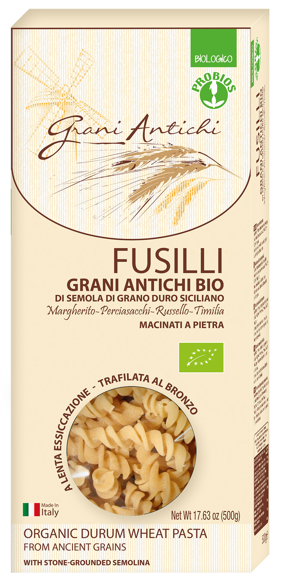 100% grano italiano bio varietà cappelli o farro dicocco integrale macinato a pietra. Pastificata a bassa temperatura.