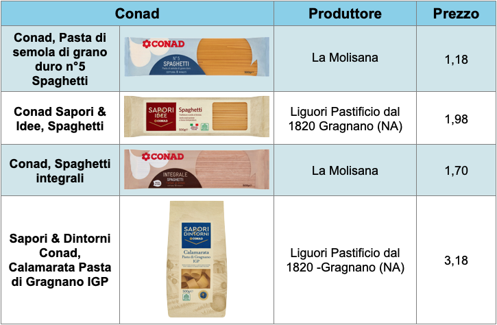 Tutta la pasta della linea principale è prodotta da La Molisana. La pasta della linea premium Sapori&Idee è prodotta dall’azienda Liguori di Gragnano. I formati regionali, a marchio Igp, della linea Sapori&Dintorni, sono invece sfornati da pastifici attivi in diverse regioni di Italia: il barese Gruppo Milo per orecchiette e cavatelli, Liguori per paccheri e calamarata di Gragnano, Aldino S.r.l. (Sondrio) per i pizzoccheri della Valtellina. I prezzi vanno da 1,18 a 3,18 €/kg. È da notare che i formati di pasta ‘standard’ a marchio La Molisana, nel sito della catena costano 2,68 €/kg, anche in questo caso, più del doppio della linea principale a marchio Conad.