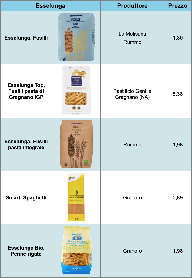Prendiamo uno degli alimenti cardine della cucina italiana: la pasta di semola secca. Spaghetti, fusilli, maccheroni proposti con il marchio del supermercato sono prodotti da pochi pastifici, fra cui alcuni molto noti, come La Molisana, con sede a Campobasso, e il pastificio Rummo di Benevento. Altri sono De Matteis Agroalimentare (Avellino), che produce la pasta Armando, e l’azienda pugliese Granoro.