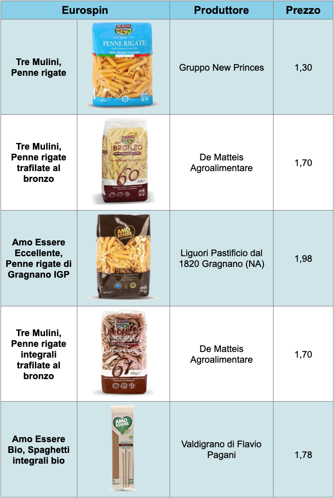 I prezzi, come si vede in tabella, variano da 0,89 a 1,98 €/kg, a parte la pasta di Gragnano che lievita a 5,38 €/kg. È interessante notare che nei supermercati della catena la pasta a marchio Rummo e La Molisana, in formati standard, costano circa 3 €/kg, più del doppio della linea principale.