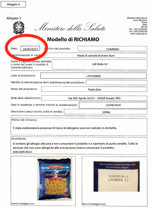 La data di affissione dell’avviso risale al 19/05/2017 da parte dell’OSA (Lidl Italia Srl), e infatti sul sito della stessa catena di supermercati si trova. Anche la valle d’Aosta ha pubblicato sulla propria pagina online dedicata alle allerta alimentari il richiamo della pasta, con in allegato un documento del Ministero della salute datato 18 maggio. Non si capisce però perché nella pagina dell’istituzione non si trova l’avviso del richiamo, dopo ben 4 giorni dalla diffusione del documento redatto proprio dal Ministero (vedi sotto).