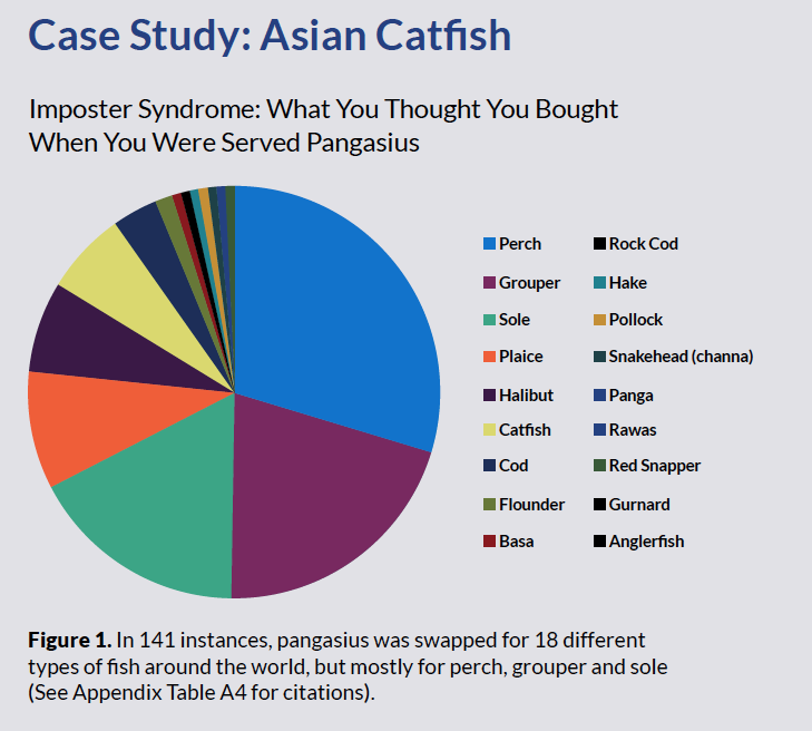La lista dei pesci usati come succedanei vede in prima fila il pesce gatto asiatico e il nasello. Il pangasio viene venduto in modo fraudolento in tutti i continenti con il nome di altre 18 specie. Di solito si tratta però di pesce persico, cernia e sogliola (vedi grafico).