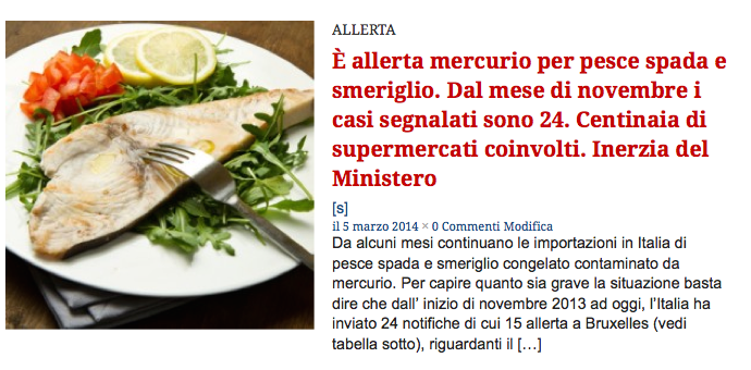 Ringraziamo il Ministero della salute, ma qualche cosa in questo discorso non quadra. Premesso che i casi per la presenza di mercurio in Italia sono aumentati ( il 5 marzo è scattato il 25 ° dall’inizio di novembre 2013 mentre nello stesso intervallo nel resto d’Europa i casi sono stati complessivamente 12), il Ministero non dice di essere di fronte ad una situazione anomala, ma si limita a dire che i PIF e gli Uvac e le ASL fanno il loro dovere. Se I PIF e gli UVAC funzionano come viene sostenuto, come mai tante partite di pesce con livelli eccessivi di mercurio non vengono bloccate alle frontiere ma arrivano sui banchi dei supermercati, dove sono le Asl che fanno i prelievi nei punti vendita.