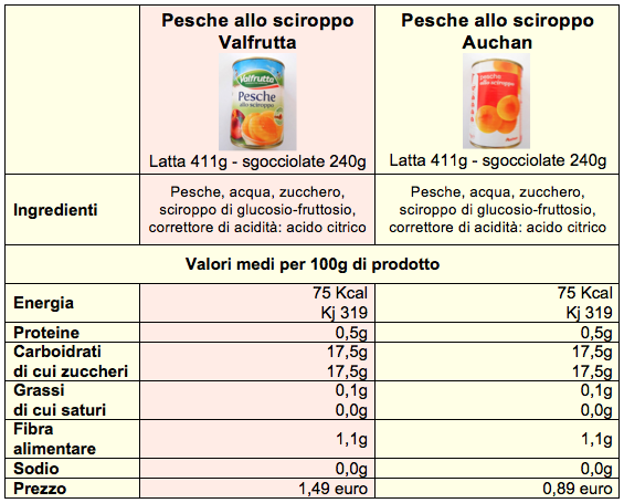 Come ci confermano in azienda è questa la materia prima che impiegata sia per il marchio Valfrutta (che ha anche il vaso di vetro da 570g) sia per la marca commerciale. Il contenuto della latta è dunque lo stesso e non esistono sostanziali differenze tra un prodotto e l’altro (vedi tabella sotto), essendo anche il processo di lavorazione abbastanza semplice e praticamente uguale. Ciò che cambia in modo significativo è il prezzo: la confezione Valfrutta costa infatti 1,49 euro rispetto a 0,89 euro delle pesche sciroppate Auchan.