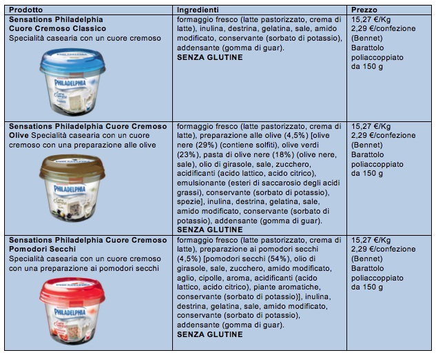Philadelphia Cuore Cremoso è la nuova proposta presentata in tre varianti presente sugli scaffali dei supermercati. Si tratta di un’altra occasione per sfruttare la cremosità del formaggio spalmabile, mescolandolo con nuovi sapori e ingredienti. Nella versione classica il nuovo Philadelphia ha un cuore morbido di formaggio, mentre nelle altre versioni contiene pomodori secchi e olive.