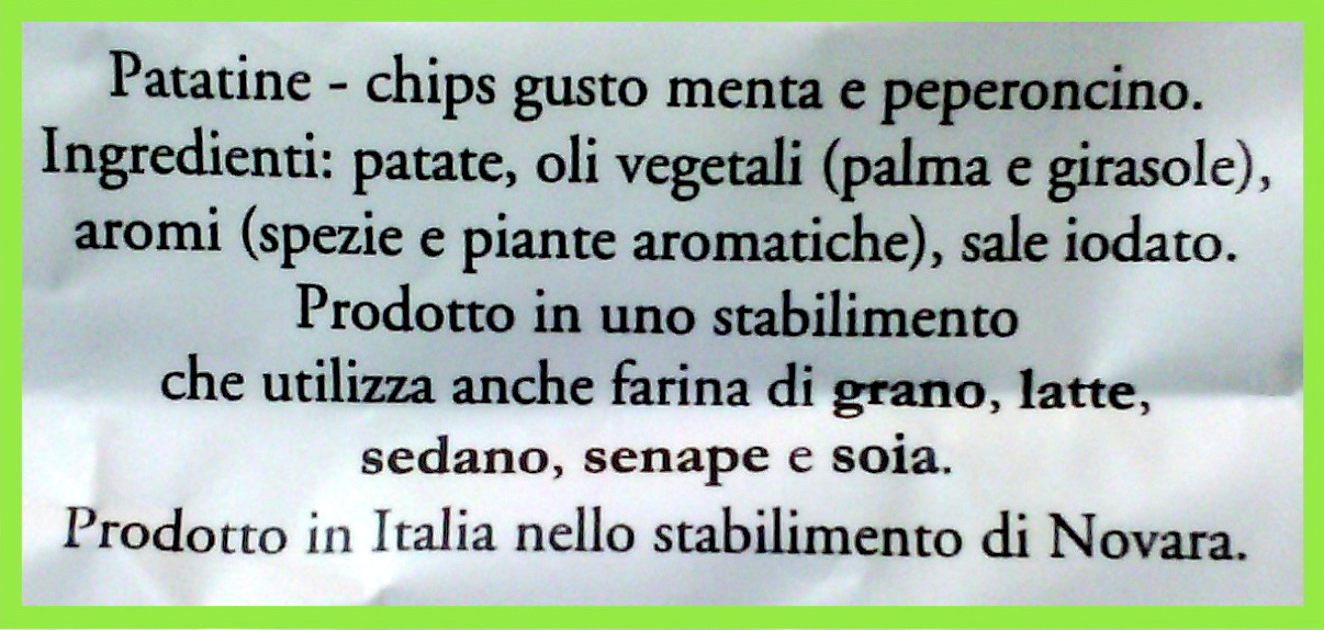 Vi scrivo per segnalare un’etichetta, a parer mio, anomala. Per pura curiosità mi sono imbattuta in un pacco di patatine Più Gusto (San Carlo) al gusto menta e peperoncino. Il pacco riporta sul fronte la seguente dicitura “più gusto fresco piccante gusto menta e peperoncino”, accompagnata dall’immagine di due peperoncini e delle foglie di menta. Tuttavia, sul retro, tra gli ingredienti non vi è traccia né di peperoncino né di menta, se non sotto la dicitura “aromi (spezie e piante aromatiche)”. Tutto questo mi ha lasciato ancor più perplessa dopo aver letto il vostro articolo riguardo una sentenza della Corte di giustizia europea sugli ingredienti di un infuso ai frutti (leggi: “L’infuso di lamponi e vaniglia non contiene aromi naturali ottenuti da questi ingredienti“).