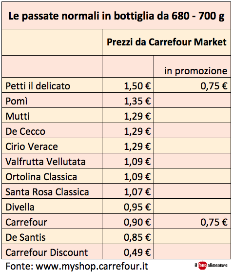 Petti propone un’ampia gamma di conserve che spazia sino al biologico. Per verificare come si posiziona sullo scaffale abbiamo preso in considerazione la passata extrafine “Il delicato”. Non è biologica ma è “prodotto da agricoltura integrata”, e sugli scaffali dei supermercati si colloca a fianco di altre marche. Petti è considerato un “premium price”, ossia un prodotto che nella sua categoria merceologica propone il prezzo più alto. Attualmente in promozione, l’acquisto risulta competitivo poiché il prezzo è dimezzato: da 1,50 euro a 75 centesimi.