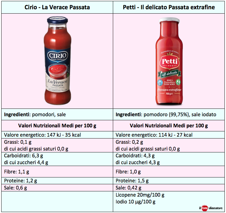 Qualcuno è in grado di spiegare perchè la passata Cirio dichiara i carboidrati 6.3 e zuccheri 4.4, mentre l’altra 4.3 e 4.3 rispettivamente. I valori degli altri nutrienti, infatti, fanno attribuire ai prodotti lo stesso grado di “concentrazione” ovvero, la medesima quantità di pomodoro fresco utilizzato! I carboidrati, nel pomodoro, sono rappresentati da glucosio, fruttosio e tracce di saccarosio che sono “zuccheri”; sarebbe interessante, comprendere, la Cirio, oltre a questi zuccheri, da chi è rappresentata la differenza tra 6.3 e 4.4.