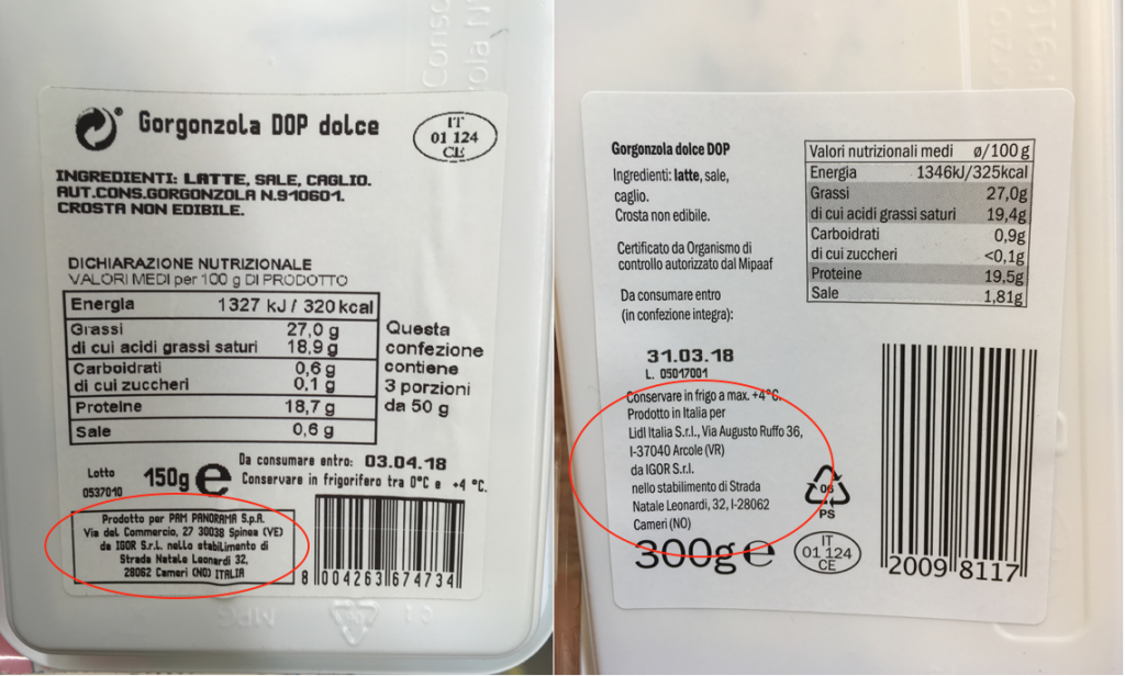 Se invece come companatico preferiamo il gorgonzola, ci sono buone probabilità di incontrare un erborinato prodotto a Cameri (Novara) dallo stabilimento dell’azienda Igor, sono prodotti qui il gorgonzola Dop a marchio Pam, Carrefour e Lidl. In questo caso il formaggio è sempre Dop ma ogni catena sceglie consistenza, cremosità e gusto e caratterizza il suo prodotto.