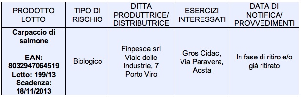 Oltre a quest’allerta ufficiale diramata dalla regione Valle d ‘Aosta, Finpesca ha inviato una lettera al supermercato Gros Cidac perchè ritiri dalla vendita un altro prodotto (Carpaccio di salmone marinato lotto 199/13 con scadenza il 18 novembre 2013) senza fornire altre specifiche.