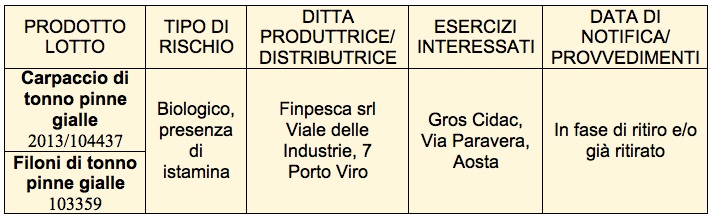Entrambi i lotti, prodotti da Finpesca, sono accusati di contenere istamina e sono stati venduti nel supermercato Gros Cidac di Aosta. In Valle d’Aosta il ritiro dagli scaffali è stato effettuato dall’azienda il 20 settembre 2013 e i prodotti non si trovano più sugli scaffali.