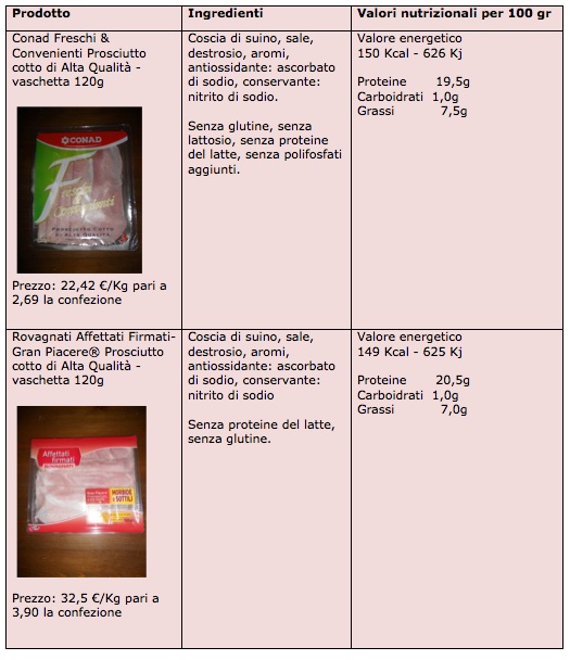 Nonostante siano minime, le differenze nei valori nutrizionali lasciano intuire che il prosciutto Rovagnati venga realizzato con un taglio più magro (+proteine, – grassi) rispetto a quello Conad.