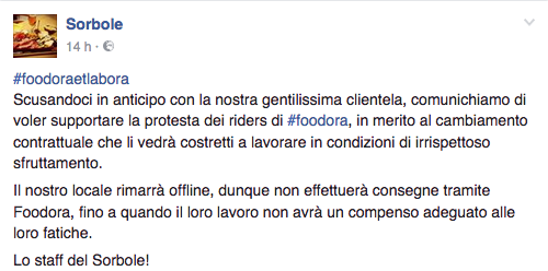 Anche il ristorante Sorbole ha deciso di supportare la protesta dei rider di Foodora, rimanendo offline e quindi non facendo consegne attraverso di essa, “fino a quando il loro lavoro non avrà un compenso adeguato alle loro fatiche”.