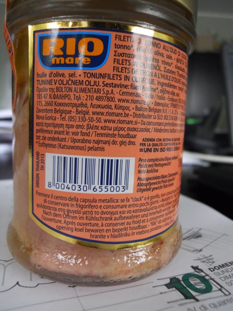 l’etichetta è purtroppo poco chiara e neppure la nostra “esperienza” (o deformazione professionale, che dir si voglia) risulta di aiuto. La retro-etichetta del vasetto di filetti di tonno Rio Mare riporta una serie di indirizzi di società del gruppo Bolton, con sedi in diversi paesi europei. Non é dato tuttavia intendere quale di queste società abbia distribuito il prodotto, né dove lo stesso sia stato realizzato.