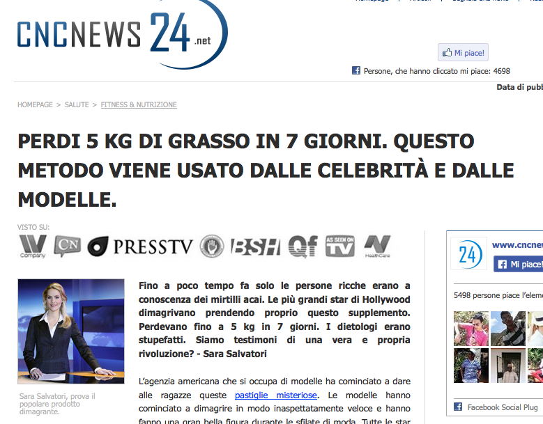 Il testo focalizza l’attenzione almeno una decina di volte su un concentrato di mirtilli denominato Acai power. A metà servizio c’è anche un filmato della BBCMEDIA dove si vede una signora che racconta come ha perso 32,5 kg. Non si tratta dell’unico caso di pubblicità spazzatura, sul sito di Ezio Mauro abbiamo trovato un altro annuncio dove si promette di perdere “12 kg in 4 settimane”. Non serve fornire altri dettagli per capire il livello di attendibilità di questi messaggi.