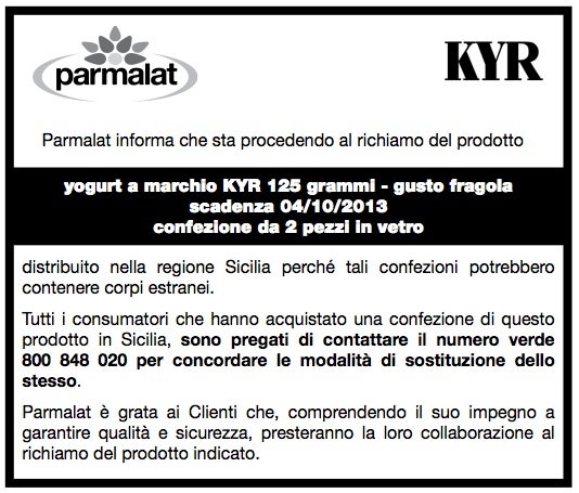 Richiamato lo yogurt alla fragola Parmalat della linea KYR in vasetto di vetro, per la possibile presenza di corpi estranei. Il ritiro riguarda esclusivamente i lotti venduti in Sicilia, per cui l’azenda ha diffuso un annunci pubblicato su due quotidiani, La Sicilia e il Giornale di Sicilia (vedi foto in basso). L’allerta è stata ripresa anche dal sito della catena di supermercati Auchan che ha rilanciato la notizia in rete e avvisato i clienti attraverso dei cartelli nei punti vendita.