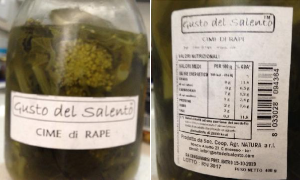 Il Ministero della salute ha diffuso il richiamo delle cime di rapa a marchio “Gusto del Salento” (vedi foto sopra) in seguito caso confermato di botulismo alimentare avvenuto dopo il consumo di cime di rapa al naturale. Il provvedimento riguarda tutti i lotti di produzione delle cime di rapa in vaso di vetro da 400 grammi (peso netto sgocciolato).