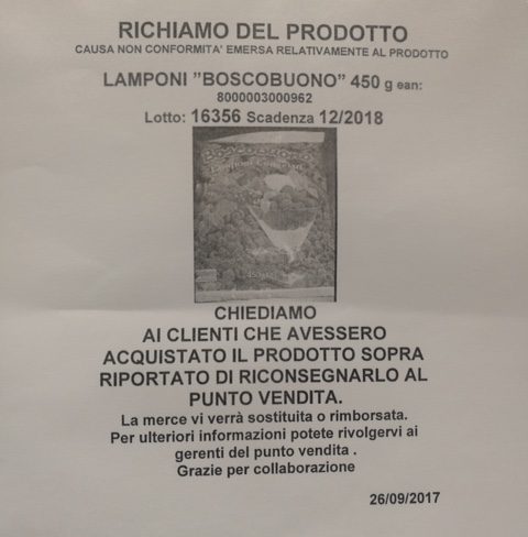Un avviso di richiamo (vedi foto sotto) è affisso nei punti vendita in cui è stato distribuito il lotto coinvolto, tra i quali l’Interspar di Parma, come segnalatoci da un lettore. Si consiglia ai consumatori che avessero acquistato il prodotto di riconsegnarlo al punto vendita, dove sarà sostituito o rimborsato.
