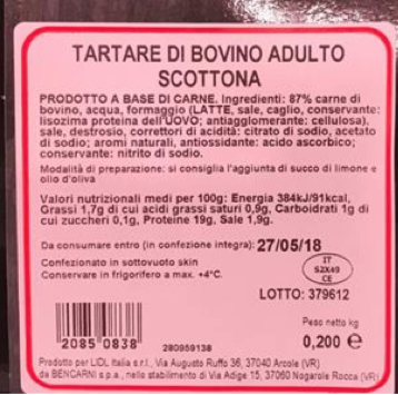 Lidl ha diffuso il richiamo di un lotto di tartare di bovino adulto scottona per la presenza di Listeria monocytogenes. Il prodotto interessato è venduto in confezioni da 200 g, con il numero di lotto 379612 e data di scadenza 27/05/2018. Il richiamo è stato diffuso anche dal Ministero della salute.