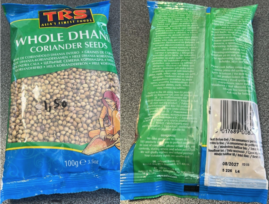 L’azienda TRS Wholesale Co. Ltd ha confezionato i semi di coriandolo richiamati in uno stabilimento nel Regno Unito.