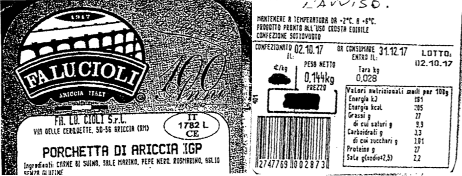 Il prodotto in questione è venduto in confezioni sottovuoto da circa 150g e appartiene al lotto 021017 con scadenza al 31/12/2017. La porchetta richiamata è stata prodotta da Fa.Lu.Cioli Srl nello stabilimento di via delle Cerquette 50-56 ad Ariccia (Roma).