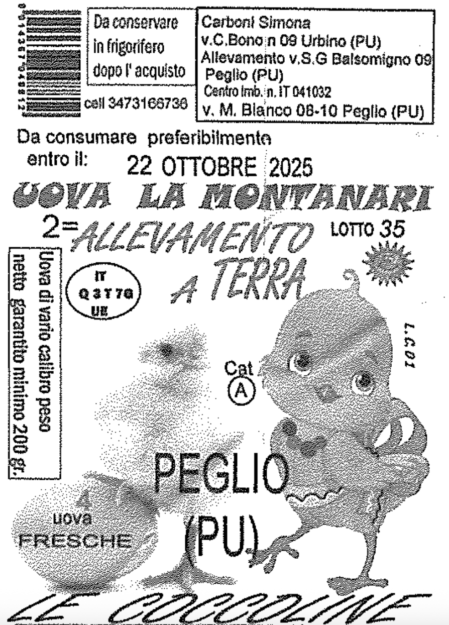 L’azienda Carboni Simona ha prodotto le uova richiamate. Lo stabilimento di confezionamento si trova in via Monte Bianco 8/10 a Peglio, in provincia di Pesaro-Urbino (marchio di identificazione IT Q3T7G UE).