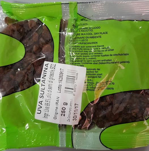Corso Fruit Srl ha richiamato alcuni lotti di uva sultanina in seguito alla segnalazione da parte di un fornitore della presenza una micotossina denominata ocratossina, nella materia prima importata dall’Iran. La contaminazione è stata segnalata anche attraverso il sistema di allerta comunitario RASFF.