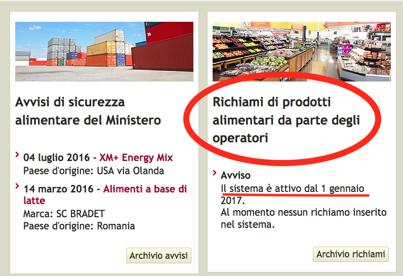 La notizia che il Ministero della salute avrebbe inaugurato il 1° gennaio 2017 una nuova pagina web dedicata al richiamo dei prodotti alimentari pericolosi per la salute, era stata annunciata sei mesi fa. Prima del Natale 2016 era uscita anche una circolare sulle procedure che lasciava ben sperare. Il documento ribadiva le regole e riassumeva le modalità da seguire quando le Asl segnalano un’allerta al Ministero. Anche noi dopo aver notato la nuova pagina sul sito all’inizio di gennaio 2017 abbiamo aspettato fiduciosi. In queste tre settimane però non è successo niente. Il testo è sempre lo stesso (vedi foto) e nessun prodotto appare in lista. Nel frattempo sono giunte in redazione già sei segnalazioni di prodotti ritirati dal mercato italiano che noi abbiamo rilanciato nel sito con le relative fotografie.