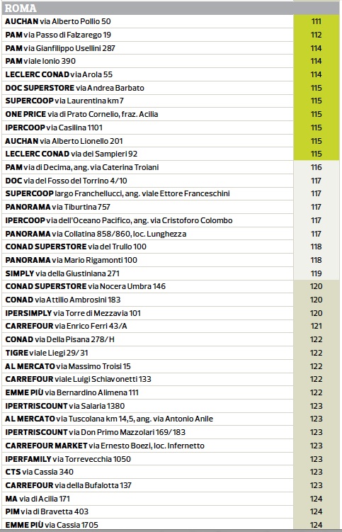 (*) Legenda. Altroconsumo assegna il valore 100 al supermercato più conveniente che quest’anno è il Super Rossetto di Verona, tra i 909 visitati nell’inchiesta. A tutti gli altri viene attribuito un indice superiore. A Roma, per esempio, l’indice 111 attribuito ad Auchan di via Alberto Pollio, essendo il più basso per questa città, indica che i prezzi sono i più convenienti (anche se risultano dell’11% più cari rispetto al supermercato di Verona ). Il valore 128 attribuito a Punto Simply di Piazza Pio IX significa che i listini sono superiori del 17% rispetto al primo in classifica a Roma
