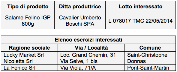 Il sistema di allerta rapido della Regione Valle d’Aosta il 18 agosto ha ritirato dal commercio un lotto di salame felino IGP della marca Cavalier Umberto Boschi S.p.A di Parma.